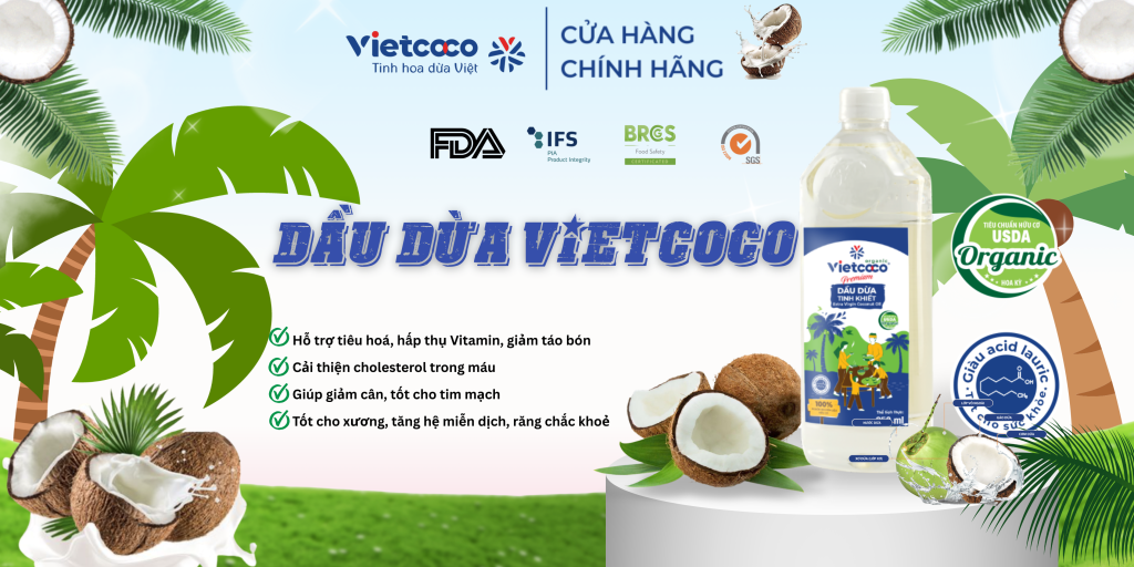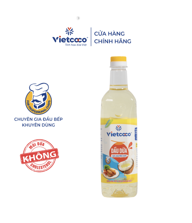 Dầu dừa tinh khiết Vietcoco được sản xuất từ những trái dừa tươi tuyển chọn tại Bến Tre, thông qua quy trình ly tâm hiện đại để giữ nguyên độ tinh khiết tự nhiên. Sản phẩm không hóa chất, không tẩy trắng, không hương liệu, đảm bảo an toàn tuyệt đối cho sức khỏe và phù hợp cho cả nấu ăn, chăm sóc sắc đẹp và hỗ trợ cải thiện thể chất. Vietcoco cam kết đem đến cho người dùng một sản phẩm tinh khiết, giàu giá trị dinh dưỡng, an toàn và thân thiện với cơ thể.